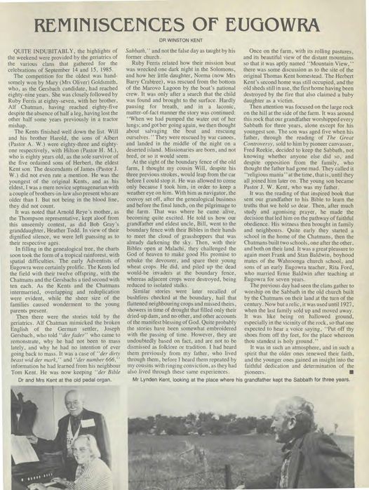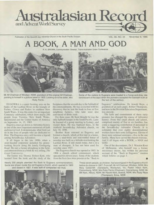 Kent soon shared the message with his family and neighbours. After being baptised in Ashfield on July 30, 1889, he returned and with the help of six families: the Chatmans, Gersbachs, Greys, Kents, Packhams, and Thompsons, founded the first Adventist church west of the Blue Mountains, which was dedicated by Pr Irwin on June 19th, 1904, and worshipped actively until 1927.