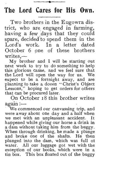 In the late 1890s, Philip Reekie rode his battered penny-farthing across the Blue Mountains to the farming region of Eugowra, where he met a farmer ploughing his field. Armed with Adventist literature, Reekie shared Ellen G. White’s The Great Controversy with local farmer Thomas Kent, who, through it, learnt of the Sabbath message, and began to worship beside a great rock on his property.